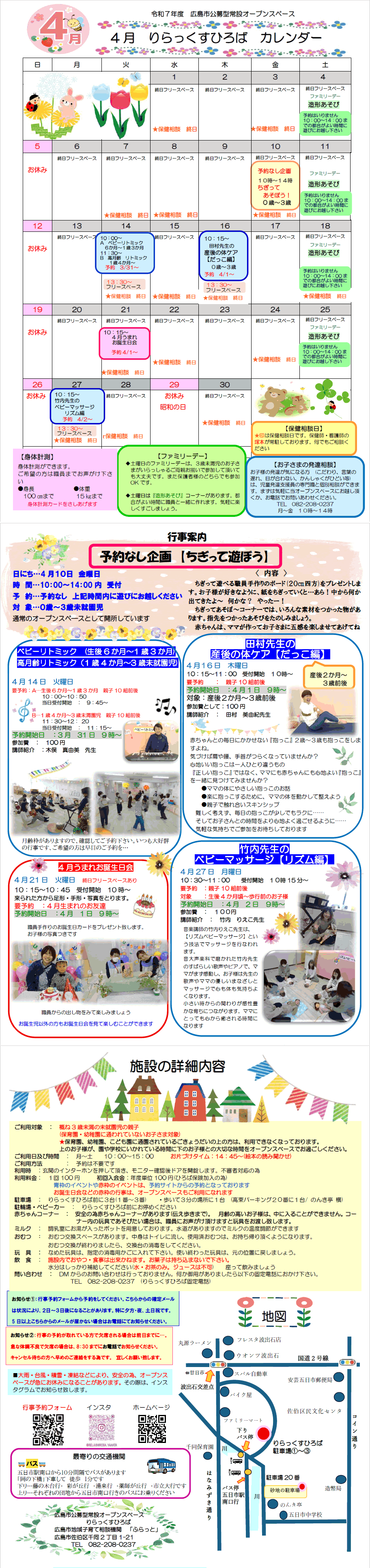 『りらっくす ひろばの想い』 保護者さまとお子さまが当オープンスペースにおいて、心も体もリラックスし、様々な方との出会いの中で素敵な思い思いのきれいな花を咲かせ、幸せのハートの木になりますように・・・と願っております。子育てアドバイザーがそっと寄り添い、悩みがあるときは、いろんな相談に応じます。お気軽に遊びに来てくださいね。